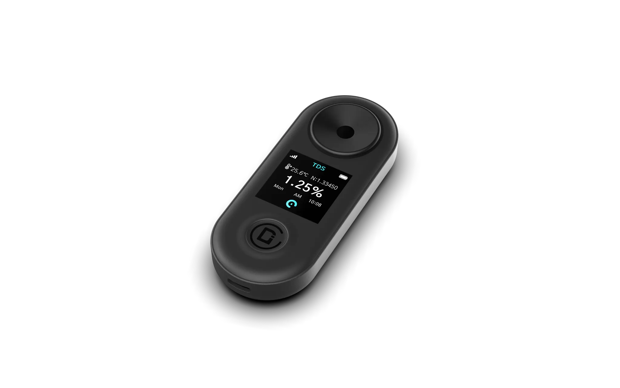 휴대용 TDS 측정기의 작동 원리는 다음과 같습니다. 빛이 액체를 통과할 때 농도에 따라 다른 각도로 굴절됩니다. 그래서 이 각도를 측정한 다음 데이터를 분석하여 농도를 도출할 수 있습니다. 커피의 TDS 값을 확인할 수 있을 뿐만 아니라 다른 음료의 다른 구성 성분에 대해서도 농도를 알아내는 데에도 도움이 됩니다. 놀랍지 않나요?