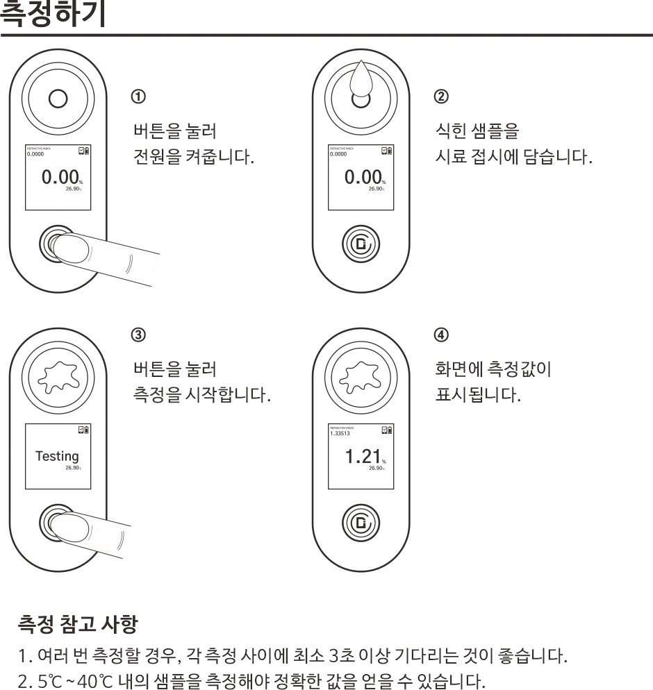 보정이 완료되면 측정을 시작할 수 있습니다. 측정 단계는 다음과 같습니다:
