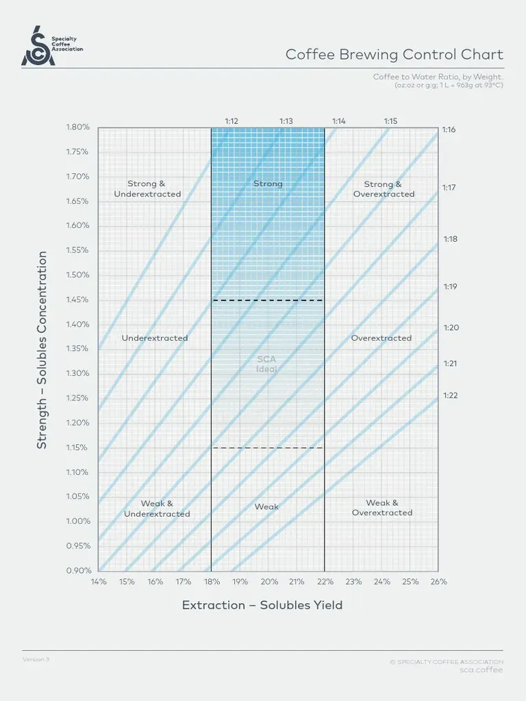 SCA가 조사한 결과 대부분의 사람들의 추출 성향을 계산하면 커피 한 잔의 TDS는 1.15 ~ 1.45 % 입니다. 이 범위 안의 TDS는 일반적으로 맛있는 것으로 간주됩니다. 에어로프레스를 프리스모로 추출한 경우는 3.5~5% TDS의 맛을 선호합니다.