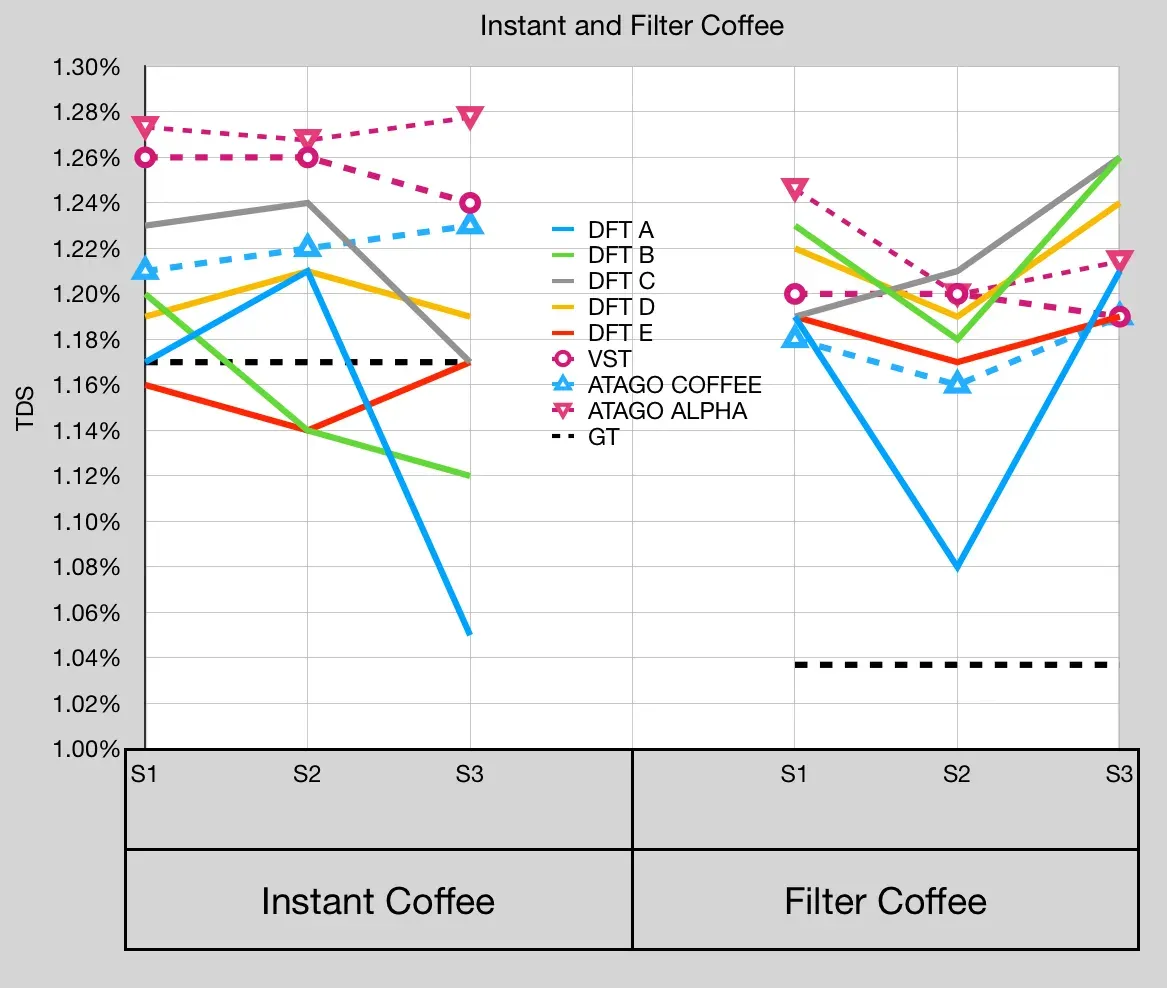인스턴트 커피(에스프레소 강도, 필터 커피 강도)의 경우 모든 샘플들이 실측값과 매우 다르지만 자기들끼리는 측정값이 유사하다. 이는 VST 와 Atago Coffee에서 사용되는 변환 알고리즘이 일부 시그널 노이즈를 설명하려는 것으로 시사할 수 있다(Atago Alpha의 판독값은 VST 및 Atago Coffee 판독값에서 파생된 공식으로 TDS 변환되었기 때문에 커피와 관련된 굴절률 측정기로 추적하는 것이 정상이다).