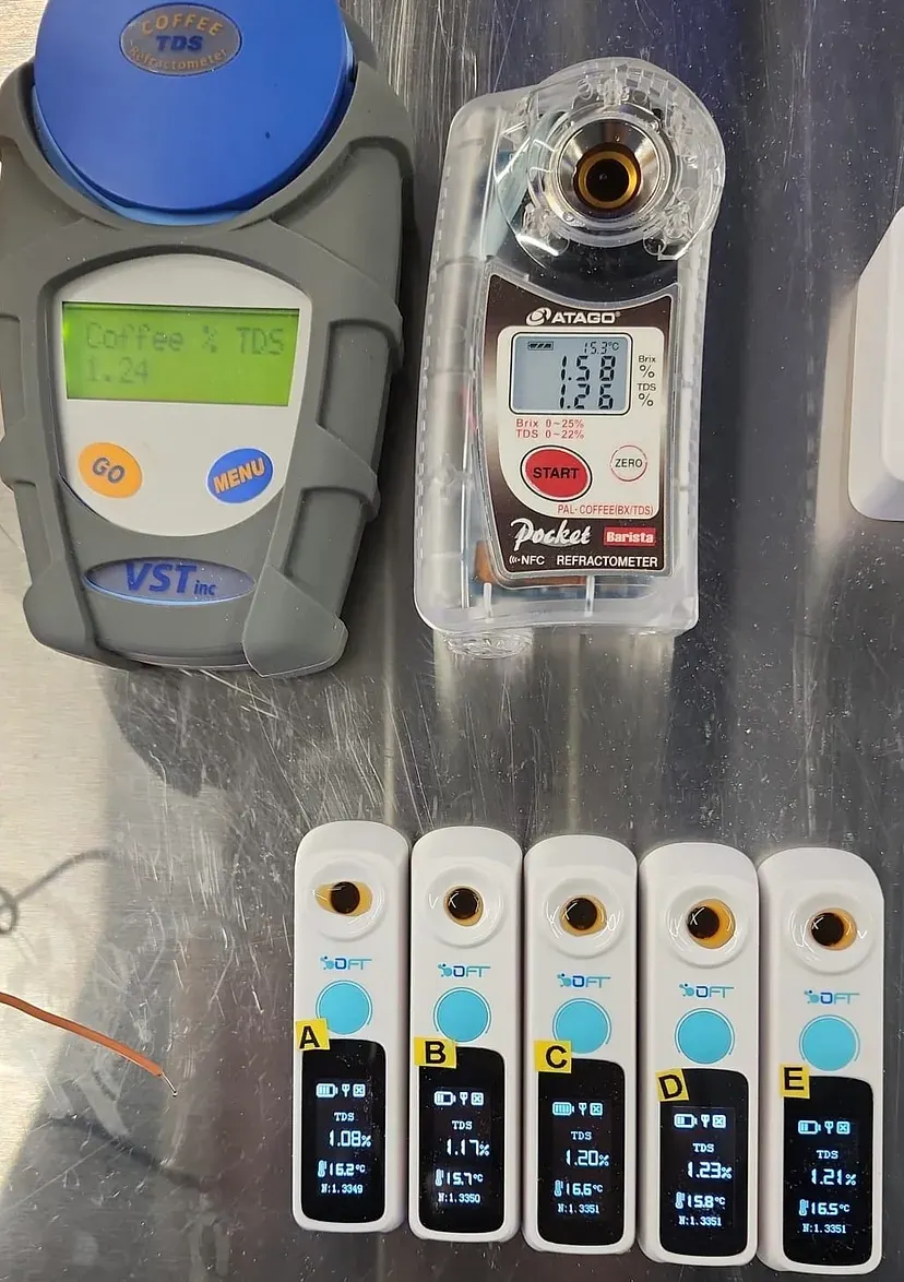 여기서 더욱 빡세지는 또 다른 문제는 VST와 Atago와 같이 잘 알려져 있고 보정된 장치들의 경우에서도 성능을 제대로 측정하는 데 어려움이 있다는 것이다. 이것은 굴절률 측정기가 커피에 그다지 유용하지 않다는 뜻은 아니지만, 여전히 우리는 굴절률 측정기가 무엇을 측정하고 있는지, 그 판독값에서 TDS(Total Dissolved Solids) 함량이 어떻게 추정되는지 더 잘 이해할 필요가 있다