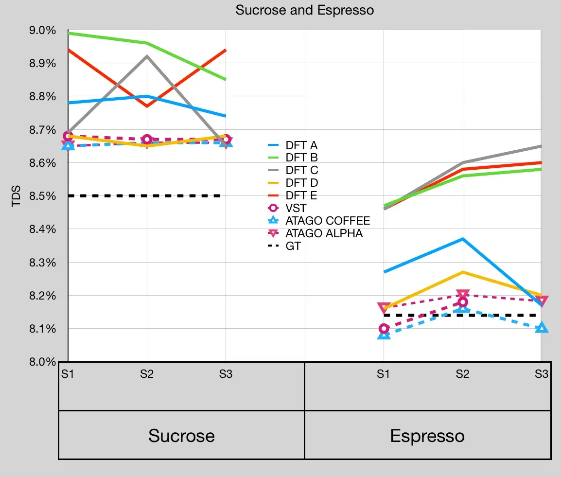 각 샘플은 동일한 용액에 대한 세 가지 측정값이 있다. Atago Coffee, VST 및 Atago Alpha에서 측정된 추세는 서로 매우 일치하지만 이전 실험에서 알 수 있듯 자당 용액은 굴절률에 훨씬 더 명확한 영향을 미친다. 그리고 다른 실험들과 마찬가지로 DFT D와 같은 장치에서 VST나 Atago에서 얻은 것만큼의 정확도를 얻을 수 있다.