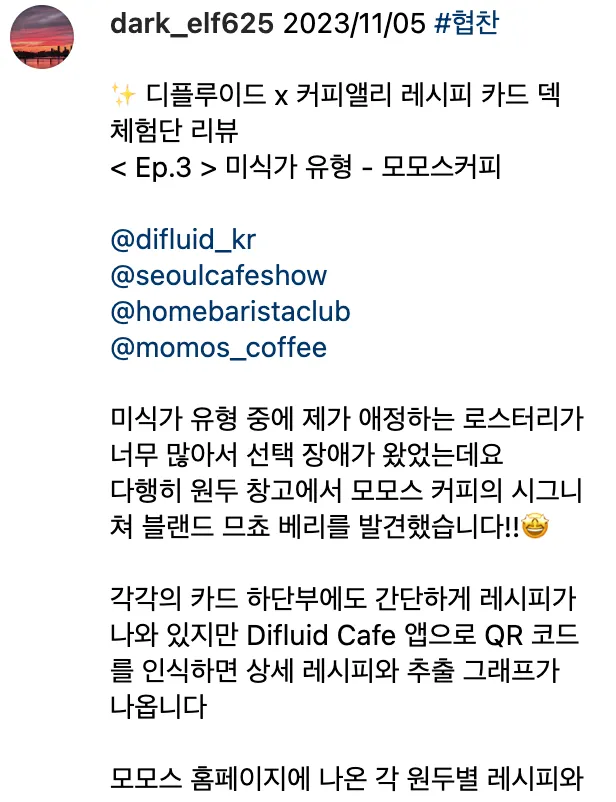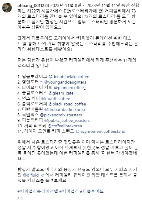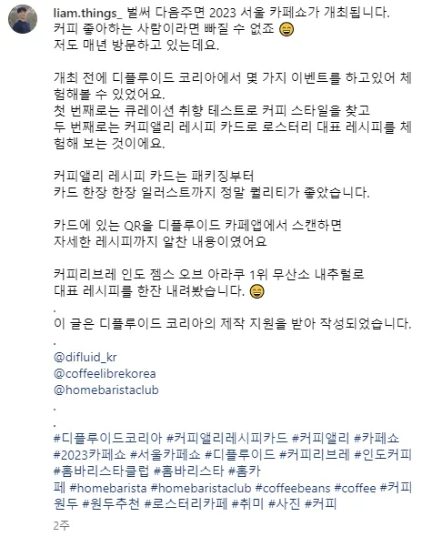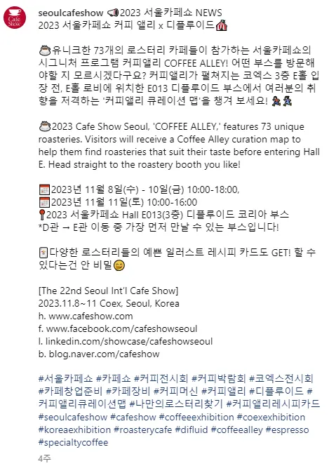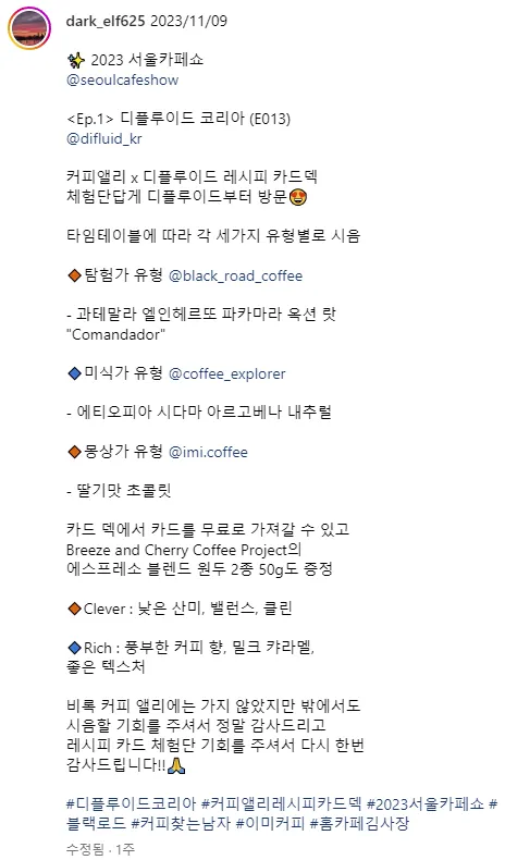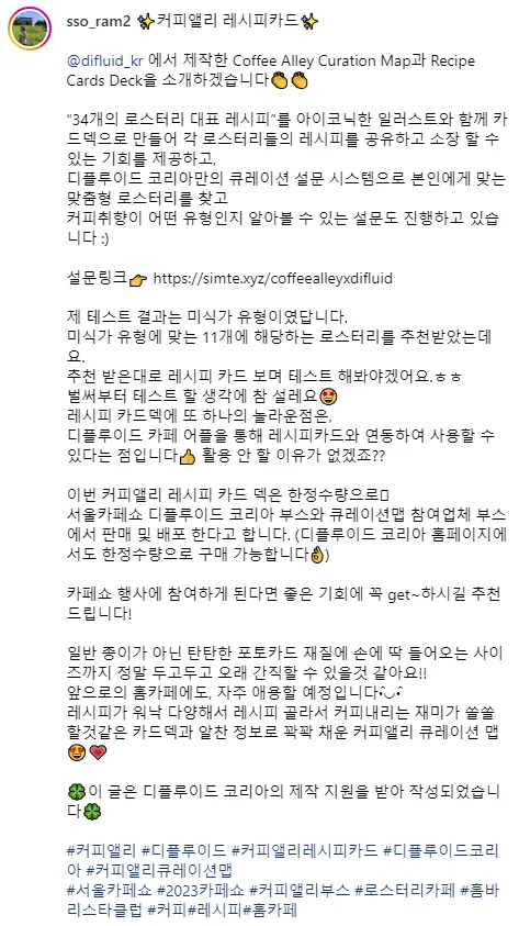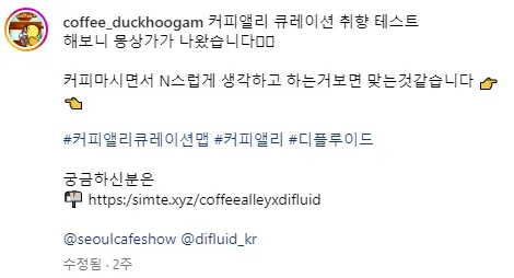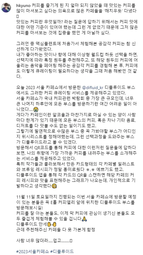 디플루이드 코리아의 서울카페쇼 참여와 관련된 SNS(인스타그램, 블로거 등), 언론 보도 리뷰 자료를 모았습니다.