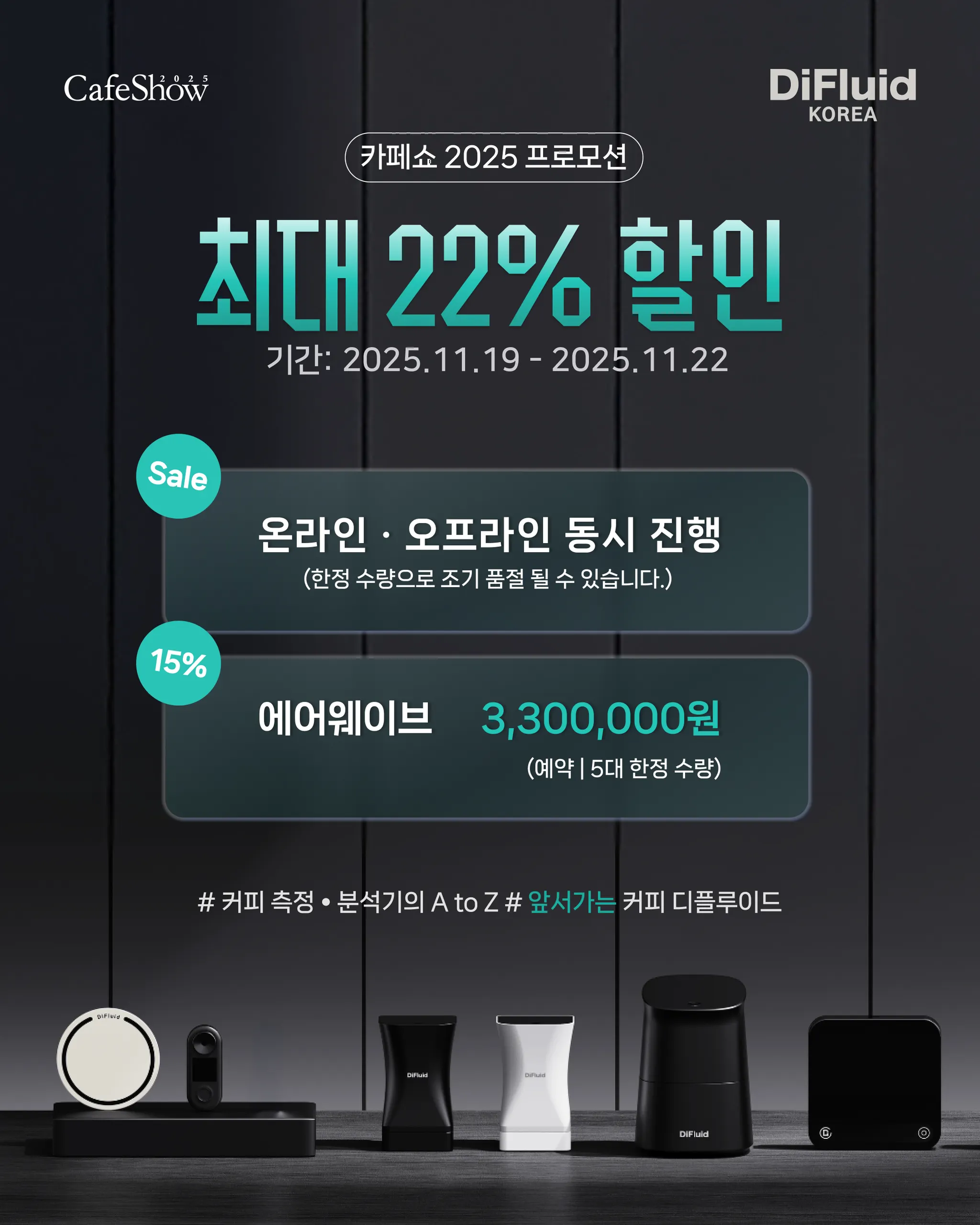 DiFluid Korea : 스마트 제연 시스템 AirWave 런칭과 함께 디플루이드의 다양한 커피 측정·분석기의 A to Z를 선보입니다. 현장에서는 제품 할인 행사도 함께 진행됩니다.