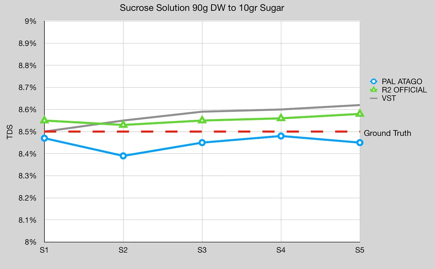 이 실험을 DiFluid R2 공식으로 반복할 수 있습니다. 그림 5에서 볼 수 있듯이, 실측값과 비교했을 때 R2 장치는 원래 DiFluid 장치에 비해 변동성이 적은 것으로 보입니다. 흥미롭게도 VST와 Atago보다 실측에 더 근접한 것으로 보입니다.