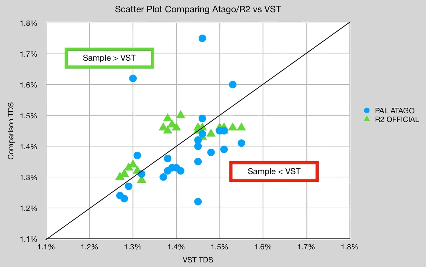 필터 농도의 샘플을 사용한 이전 결과를 보면 VST와 Atago가 기준값보다 약간 낮았습니다(그림 3). 이 그래프를 VST와 Atago로 분리할 수 있습니다. 이는 기준값이 알려진 몇 가지 솔루션에서 나타난 차이입니다.