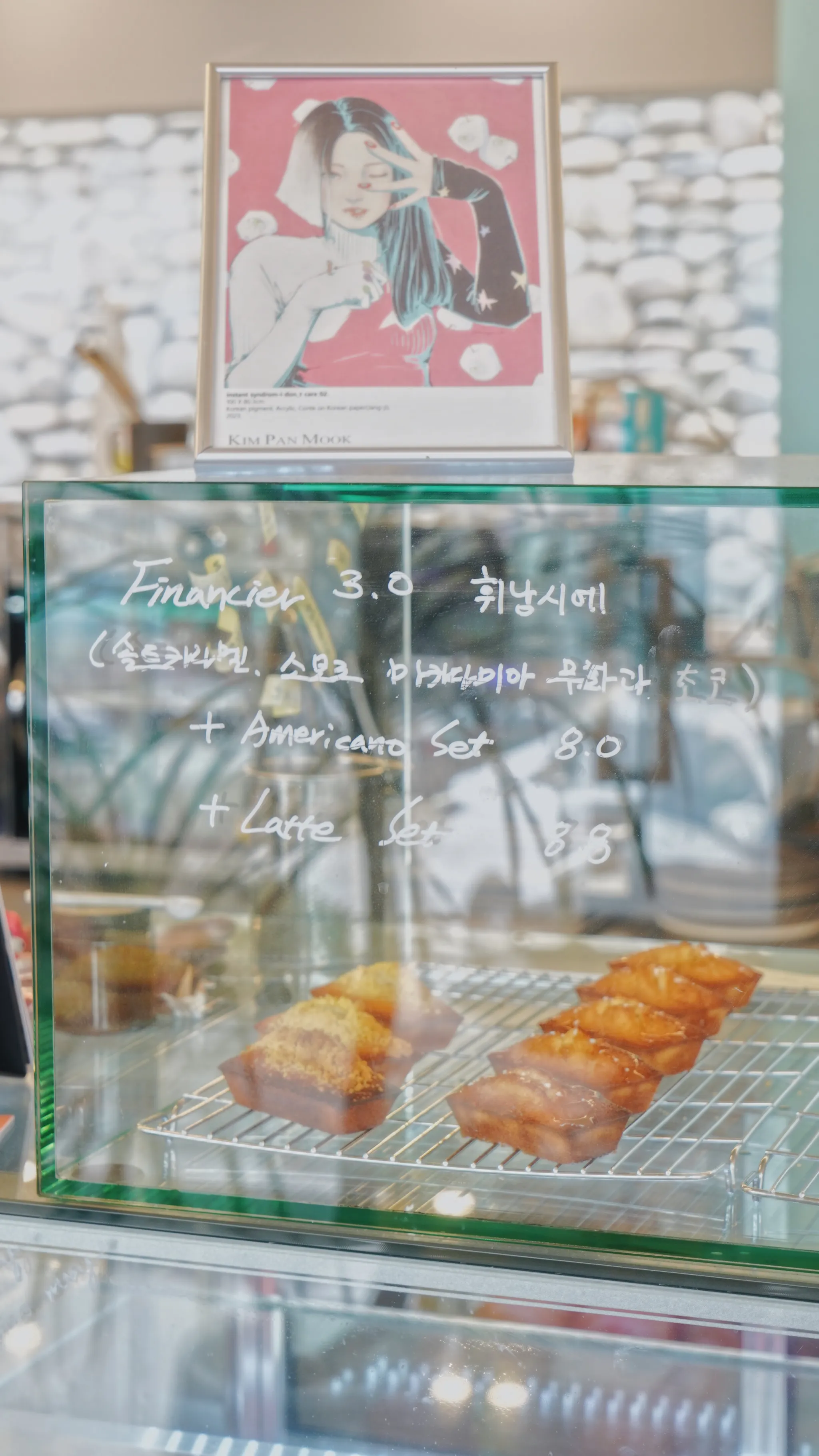 쇼케이스에는 대표님이 직접 구운 휘낭시에가 가득 진열되어 있었는데, 보기만 해도 바삭한 식감이 느껴질 정도였습니다. 딸기 생크림 케이크와 교토 우지 말차 빙수는 이 카페를 대표하는 시즌 메뉴입니다.