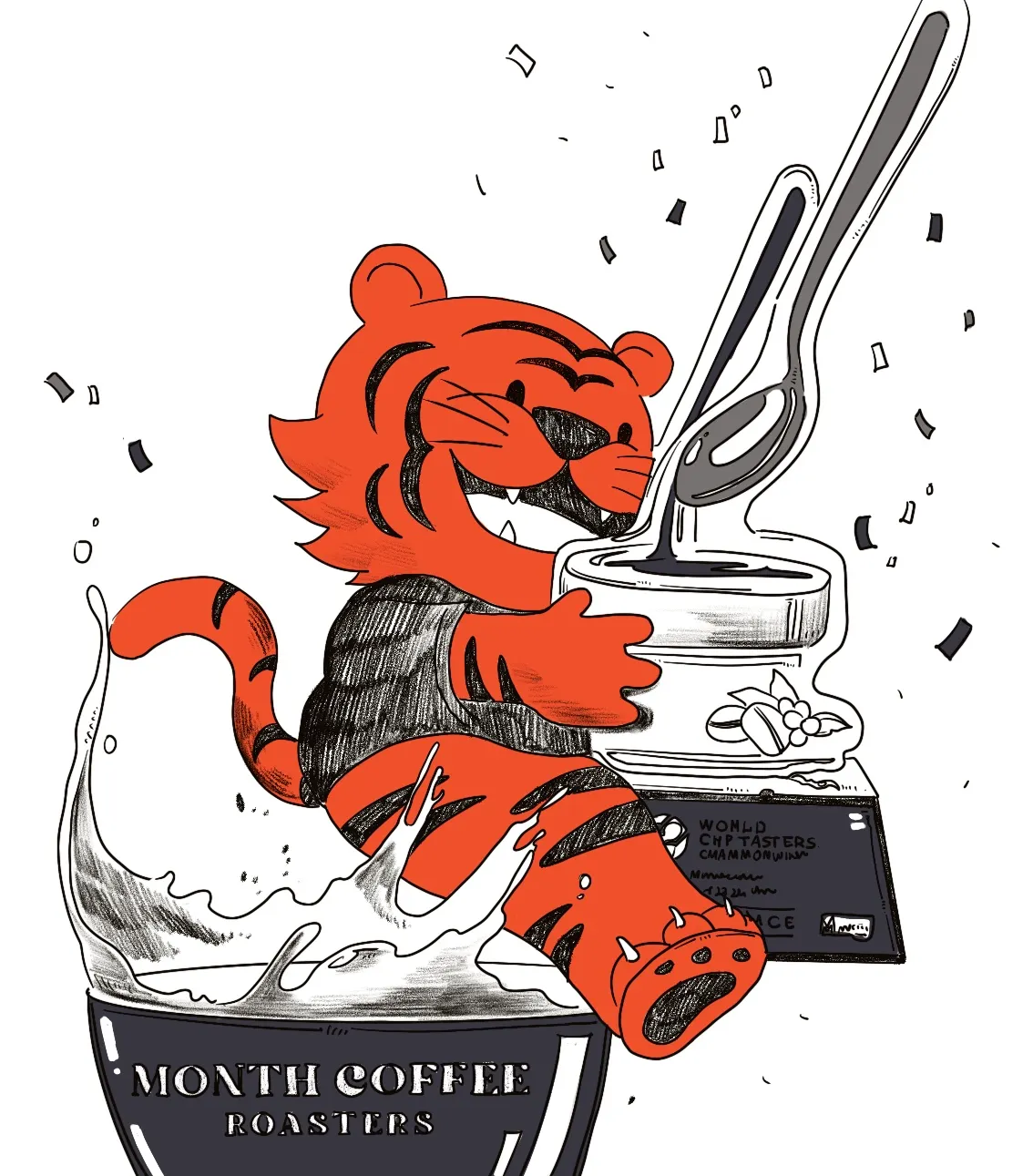 작품 : 우아한 호랑이와 함께하는 커핑 대회의 승리. 그 안에서 흐르는 행복의 순간들이 반짝인다.