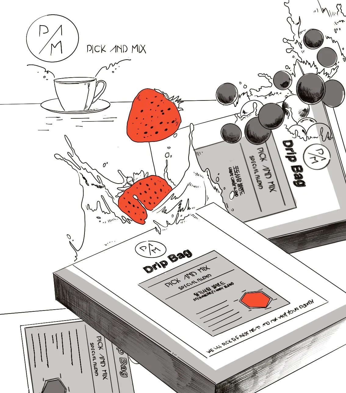 소개 : '픽앤믹스'는 최상의 커피를 PICK하고, 완벽한 블랜드를 위해 MIX합니다. 특별한 블렌드 커피가 주 상품이며, 스페셜티 커피의 대중화를 추구합니다. 쉽고 직관적인 명칭과 맛으로 스페셜티 커피의 장벽을 낮춥니다.