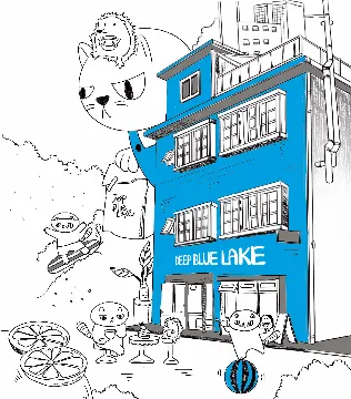 작품 :시원한 파란 건물과 시크한 고양이의 조화가 즐거운 빌딩 풍경을 아름답게 살려준 마법같은 일러스트. 커피는 차처럼 깊은 여운을 간직한 음료입니다.