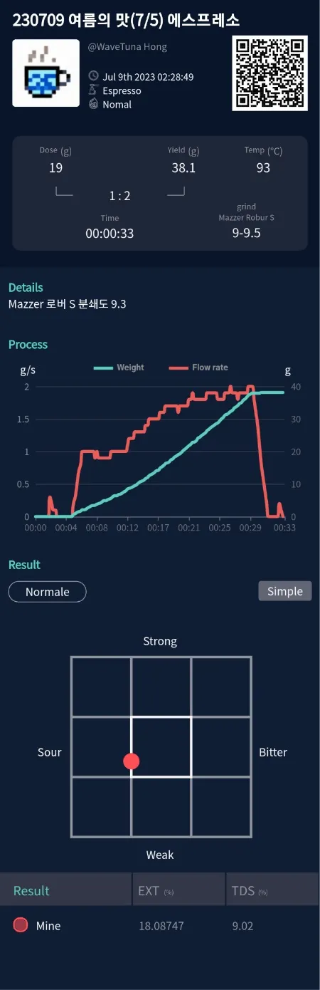 최종 추출된 에스프레소의 TDS는 9.02% 추출 수율은 18.08%로 블렌드의 특성이 잘 드러나면서도 마시기 부담없는 에스프레소입니다.