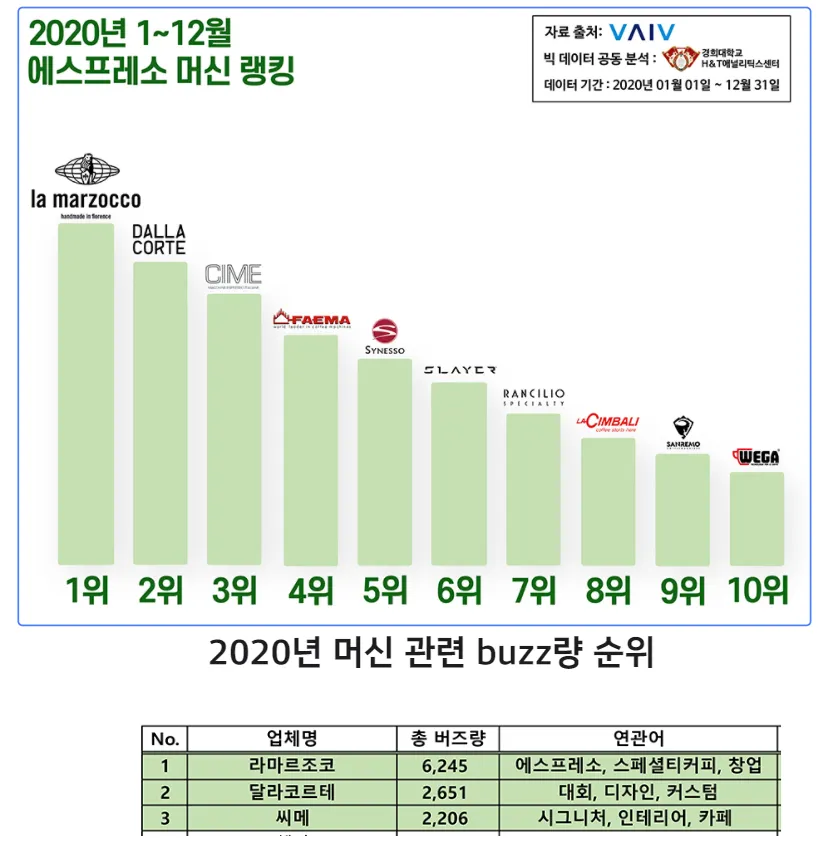 위는 2020년 에스프레소 머신 버즈량 결과이다. 버즈량 결과 ‘라마르조꼬’, ‘달라코르테’, ‘씨메’, ‘훼마’, ‘시네소’ 순으로 랭크 되어 있는 것을 볼 수 있다. 그렇다면 저 버즈량을 통해 현재 카페에서 사용하는 머신 브랜드 선호도를 예상하고 많은 사람이 사용하는 브랜드라고 생각을 해도 되는 것일까?