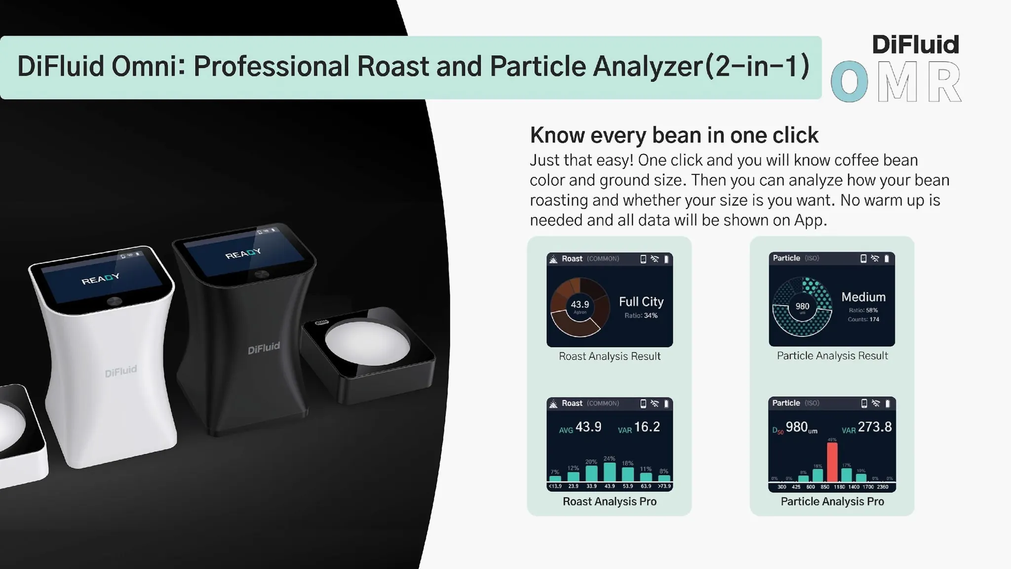디플루이드는 지금까지 시장에 있던 기존의 도구들보다 더 향상된 기능, 더욱 편리하게 사용할 수 있도록 개발을 멈추지 않고 있습니다. 10월경 새롭게 출시할 OMIX 는 생두가 가진 밀도, 수분함량과, 수분활성도를 측정할 수 있어, 더 나은 로스팅과, 더 나은 생두 보관 및 관리를 가능케 해주는 제품입니다.