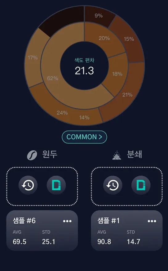 그로인해 생두가 잘 로스팅되었는지 확인하기위해서는 원두 표면뿐만 아니라 원두 내부까지 확인해야하는데요, 디플루이드 옴니는 원두 표면색도를 1차 측정하고, 분쇄된 원두색도를 2차 측정하여 원두 내 외부의 색도차이를 비교하고, 로스팅이 잘 되었는지 확인하는 기능이 있어, QC에 활용할 수 있습니다