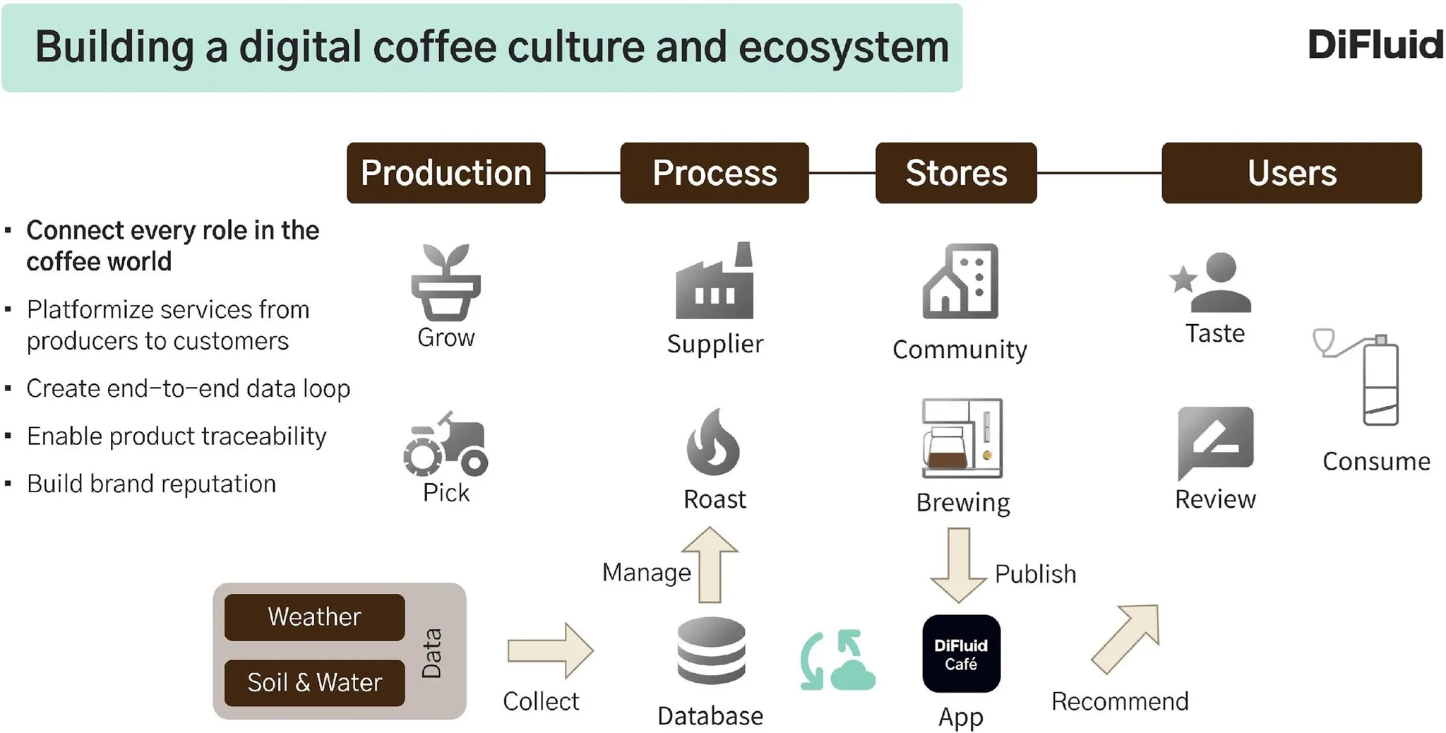 디플루이드는 앞으로 생두의 생산에서 부터 커피의 소비까지 이어지는 과정에서 발생하는 데이터를 수집하고 관리하려는 목표를 가지고 있어요.