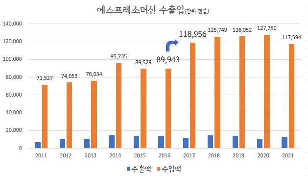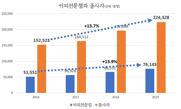 커피전문점만 별도로 통계 된 2016년부터 매년 13.9% 증가하고(51,551개→76,145개), 종사자도 13.7% 비율로 증가(152,523명→224,328명)하고 있다. 커피 머신의 수입이 꾸준히 증가하는 것은, 커피전문점이 증가하는 것과 관련 있다는 것을 통계로도 확인할 수 있다.