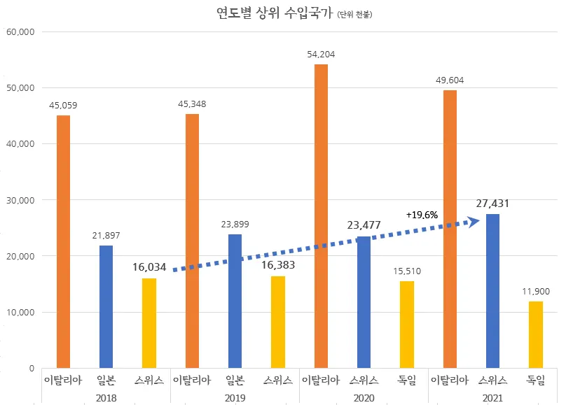 스페셜티 커피를 만드는 커피 머신은 유럽 국가 제품을 선호하는 것을 확인할 수 있다. 특징적인 것은 아탈리아에서는 조금 감소했으나, 스위스는 꾸준하게 증가(16,034천불 → 27,431천불/연평균증가율 +19.6%)하고 있다.