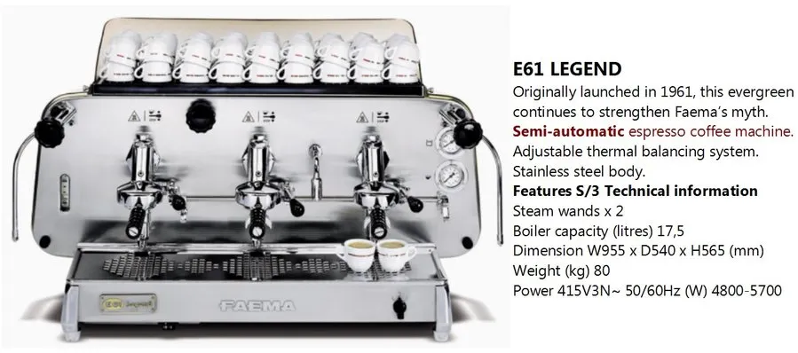 1961년 탄생하여 지금까지도 인기를 가지고 있는 FAEMA 사의 E61이 대표적인 잘 디자인된 머신이 아닐까 생각한다. 그래서 E61을 셈플로 하여 각 디자인 특징들을 확인해 보자.