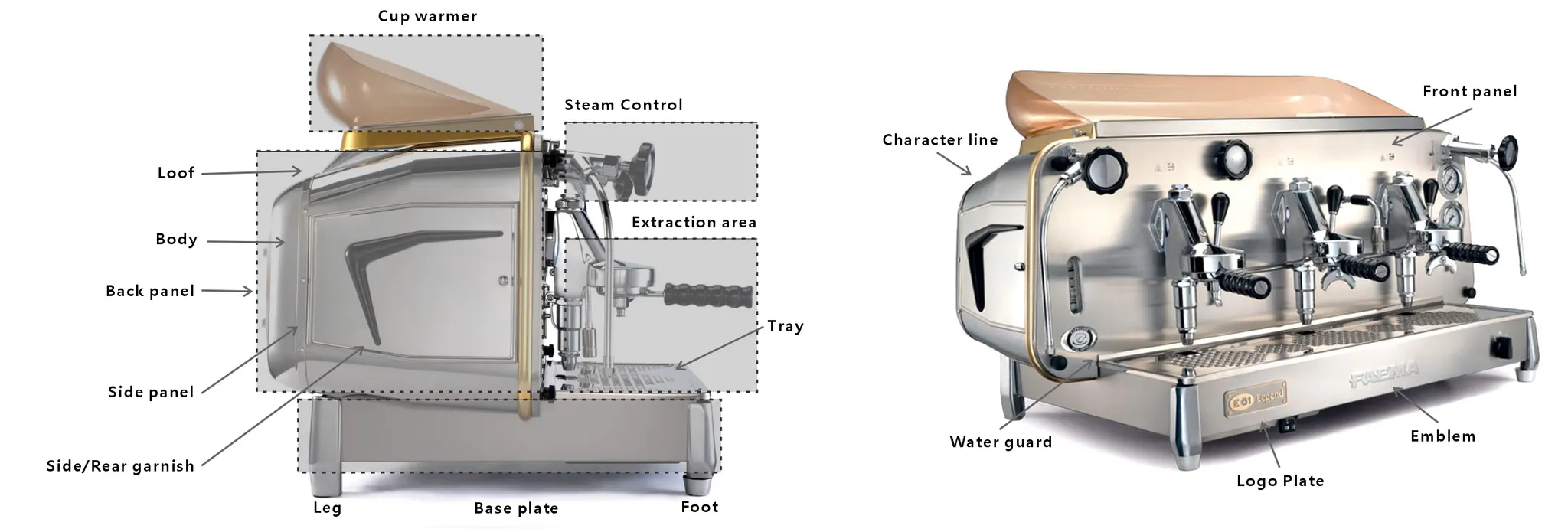 자동차의 디자인도 그렇듯 새로운 에스프레소 머신에도 여러 가지 디자인 요소와 기능적 구조로 되어 있다. 아래는 내가 생각하는 디자인 요소들을 정리해 보았다.
