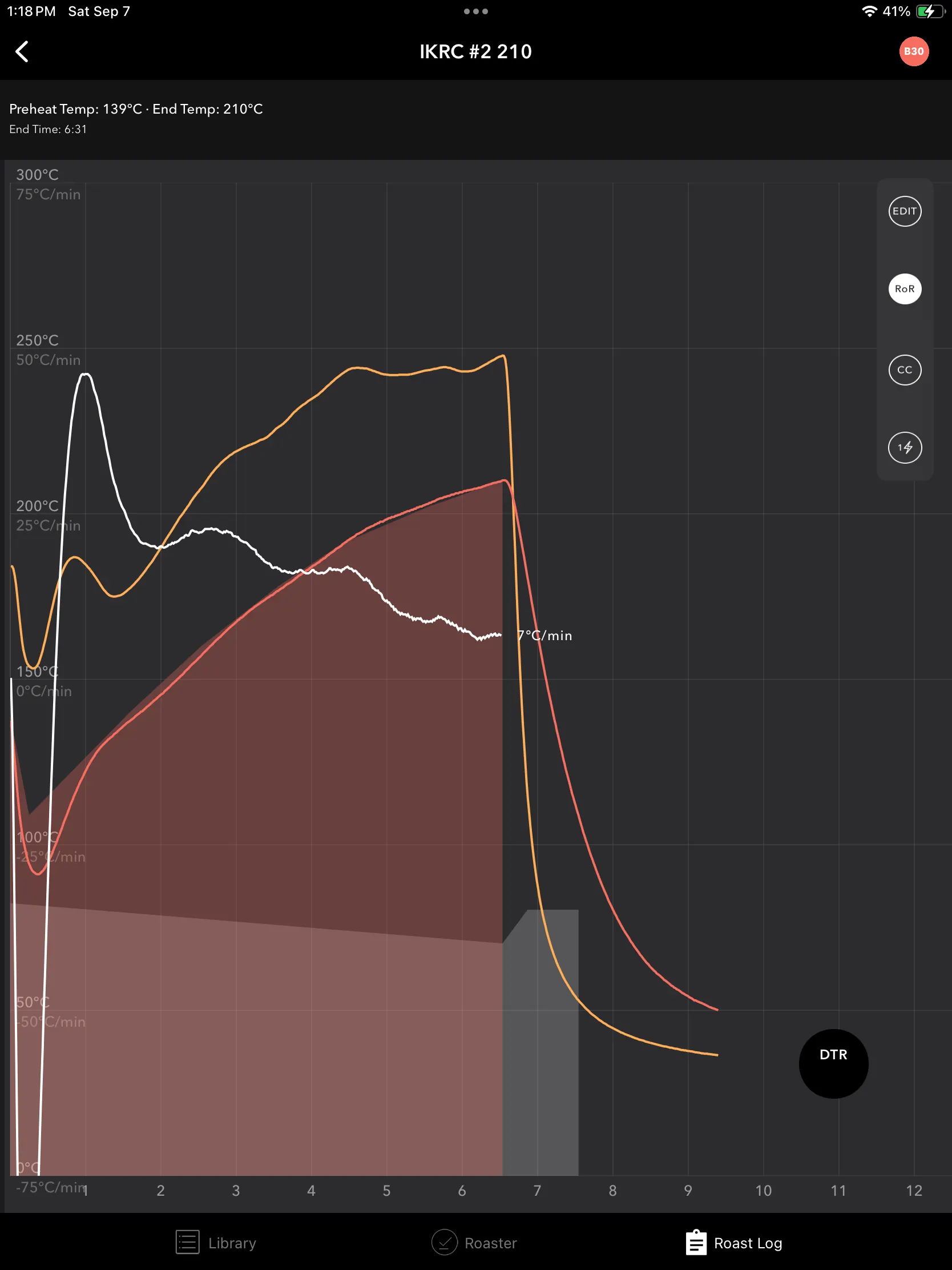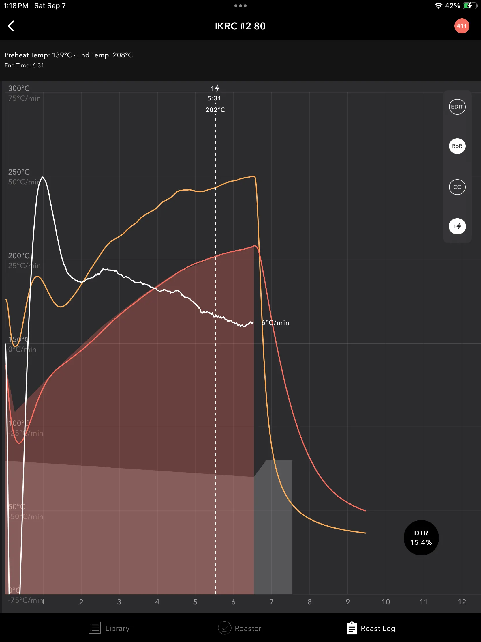 예를 들어, 전체 로스팅 시간이 10분이고, 발현 단계가 2분 동안 지속되었다면, DTR은 20%가 됩니다.