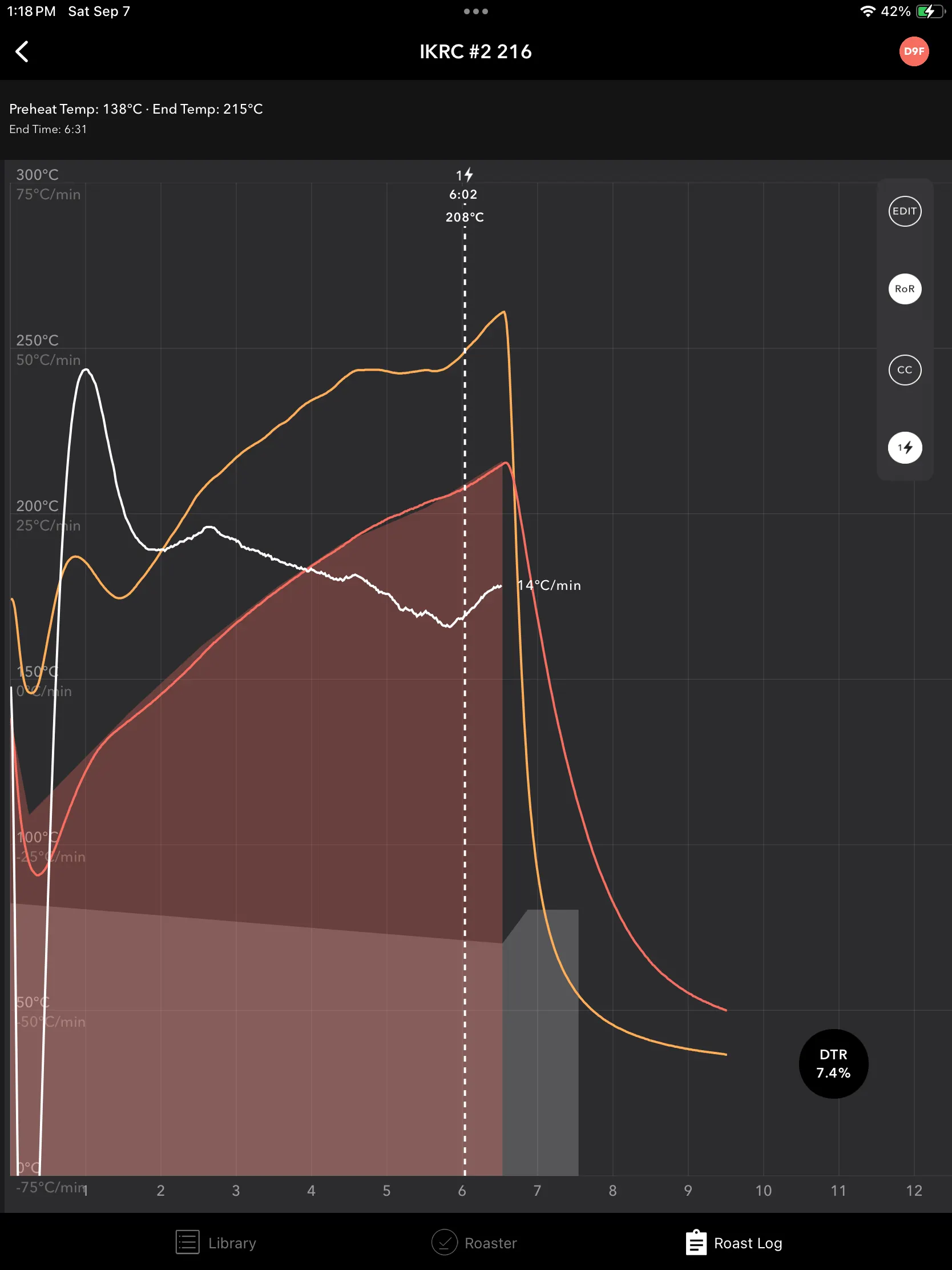 6번 로스팅 | 배출 216℃ | 138℃ | 208℃ | 6:02 | 215℃ | 6:31 | 86.1g |