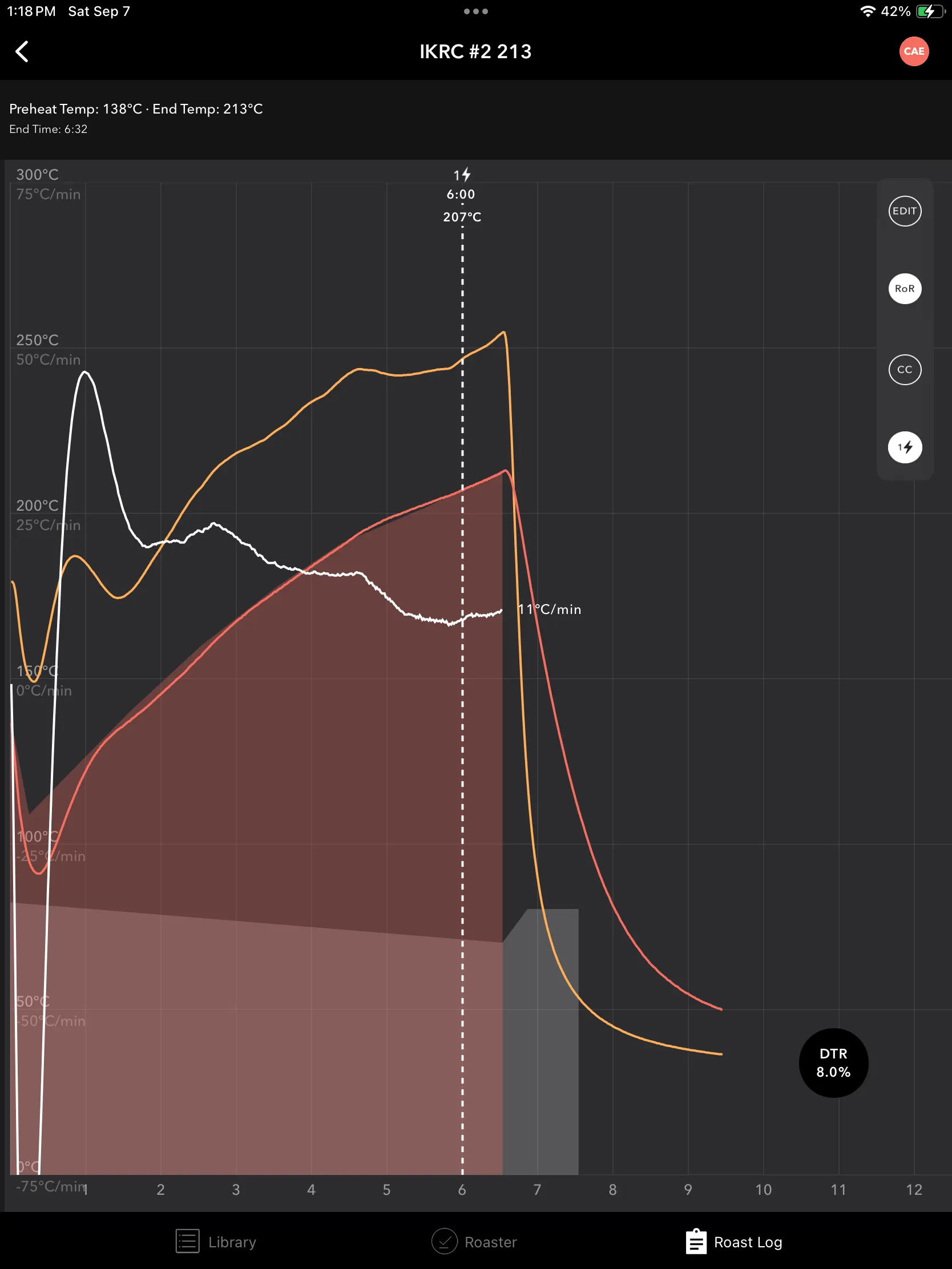 5번 로스팅 | 배출 213℃ | 138℃ | 207℃ | 6:00 | 213℃ | 6:32 | 86.1g |
