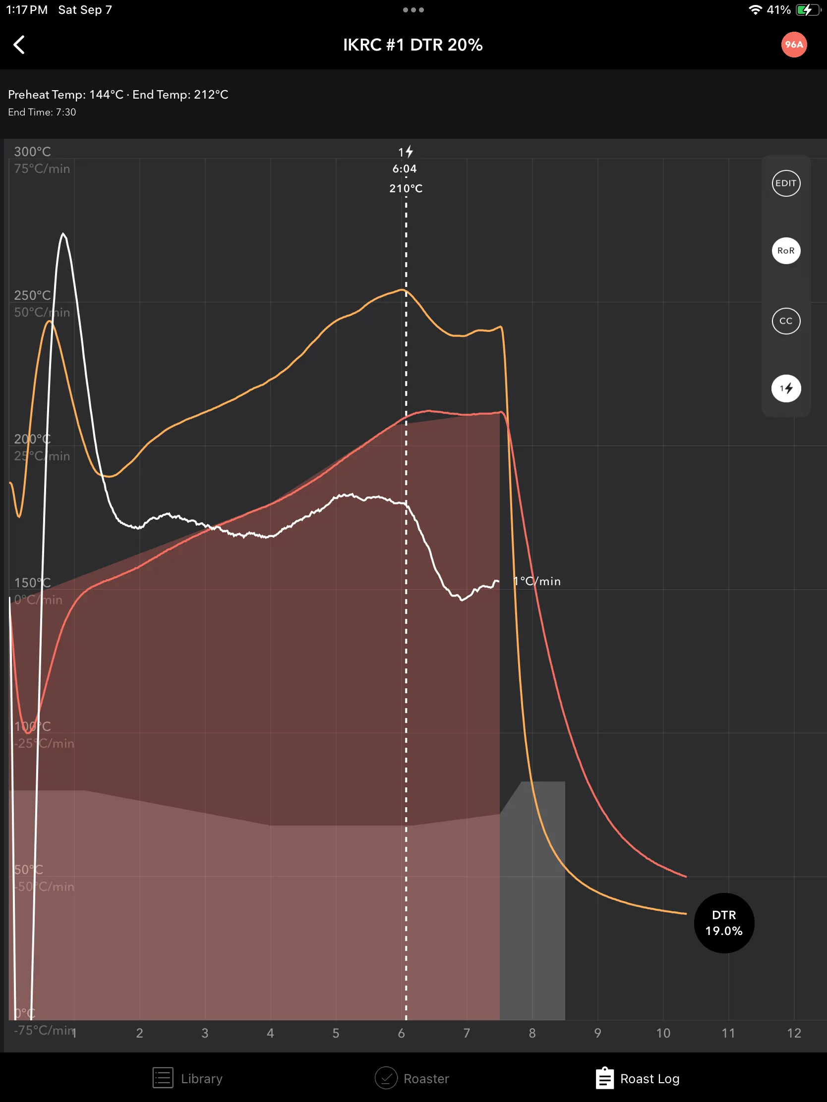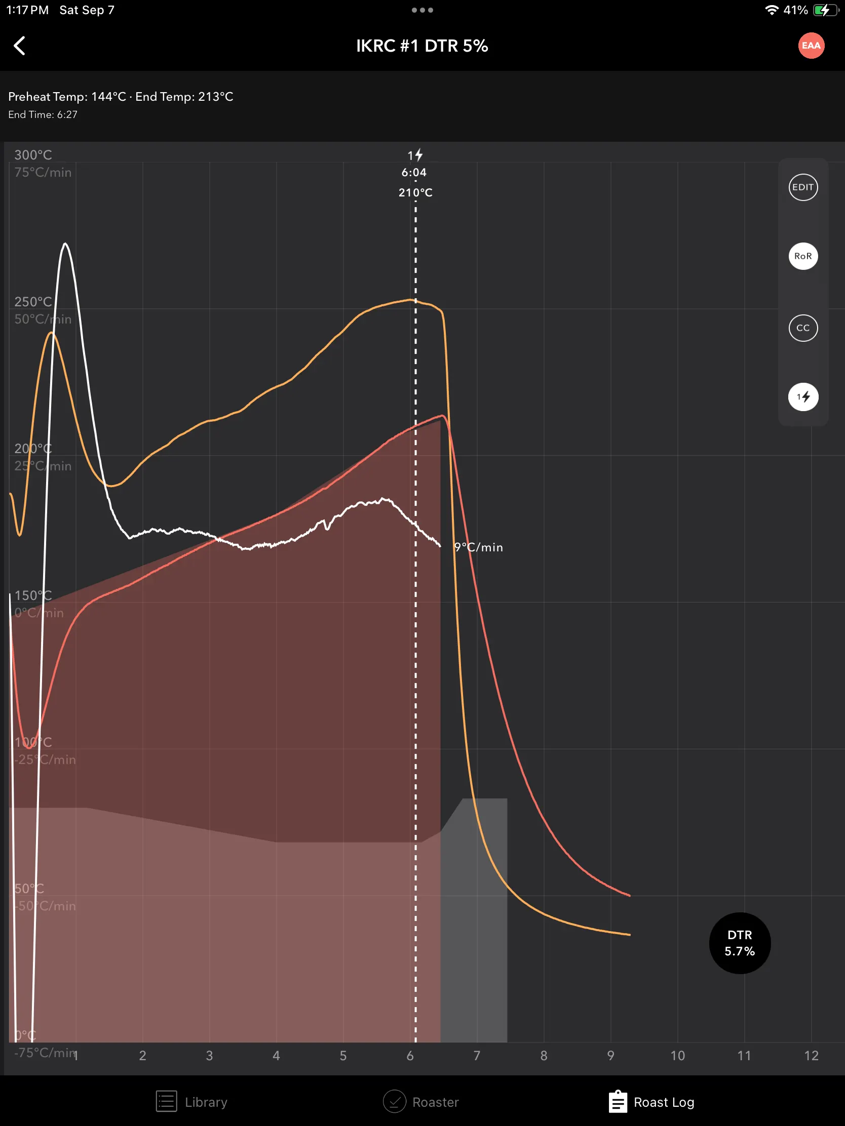 1번 로스팅 | DTR 5% | 144℃ | 210℃ | 6:05 | 213℃ | 6:27 | 86.2g |
