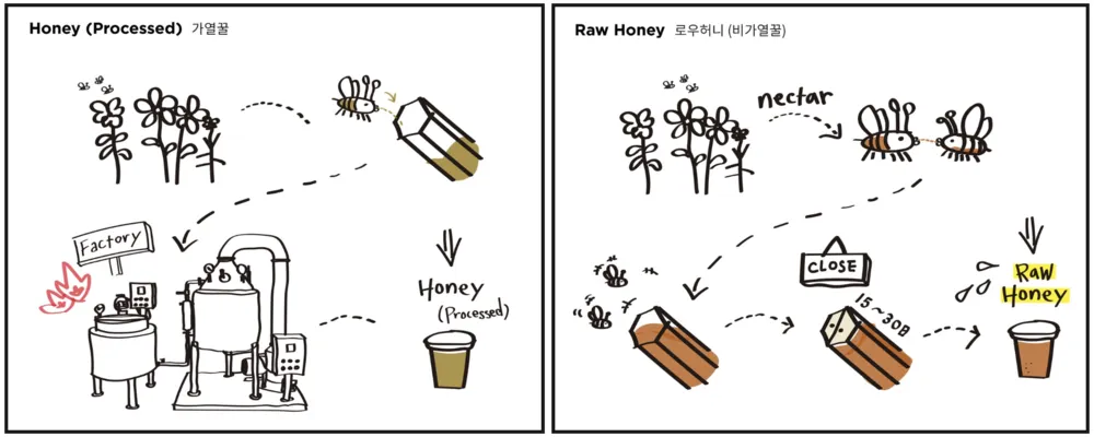 이 꿀을 최소한으로 걸러 채밀한 것이 로우 허니(Raw honey)입니다
