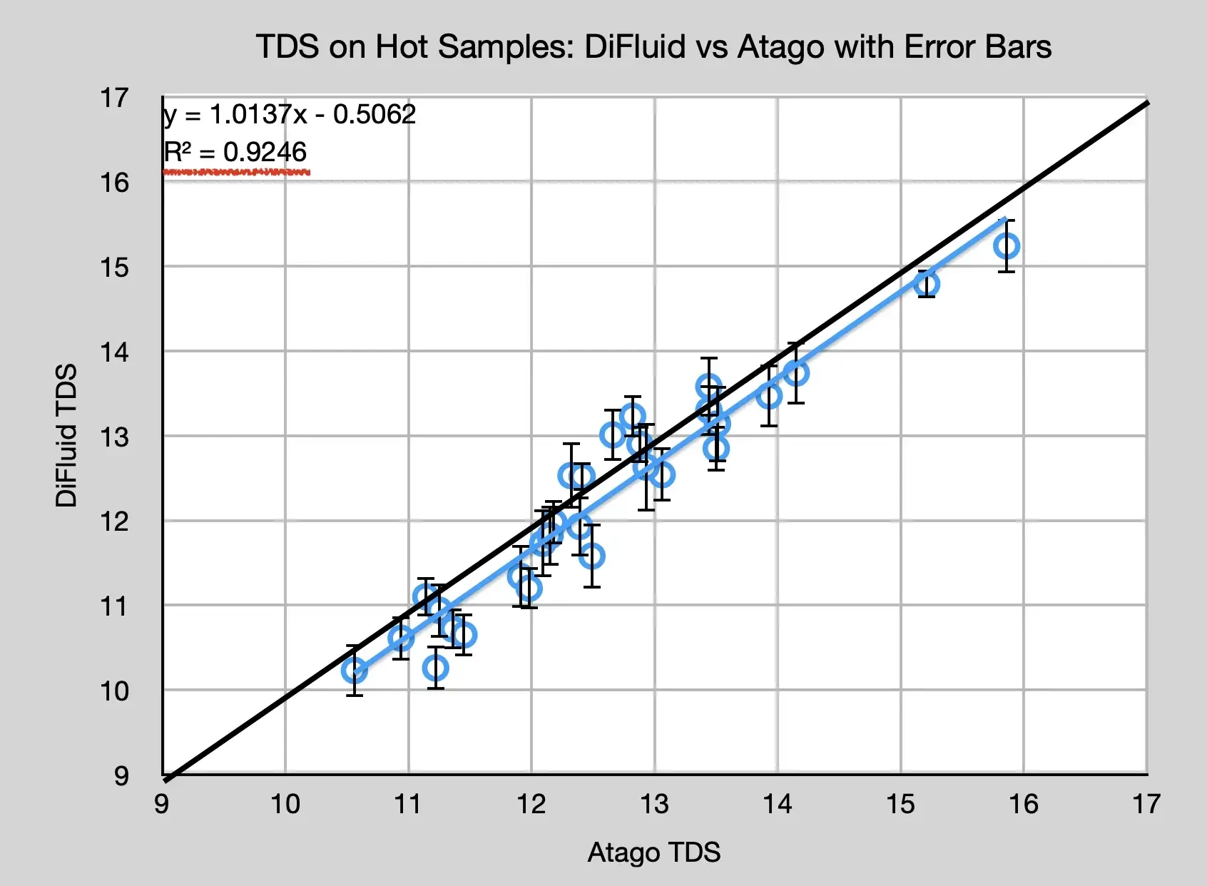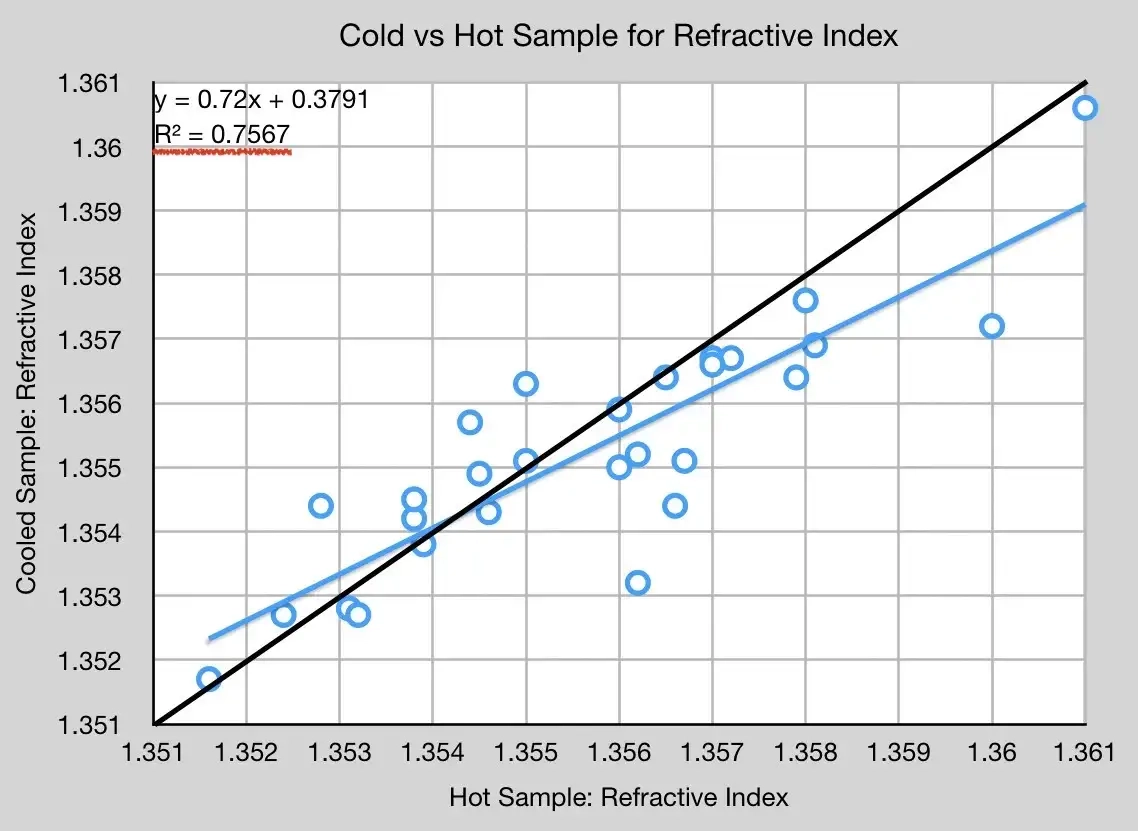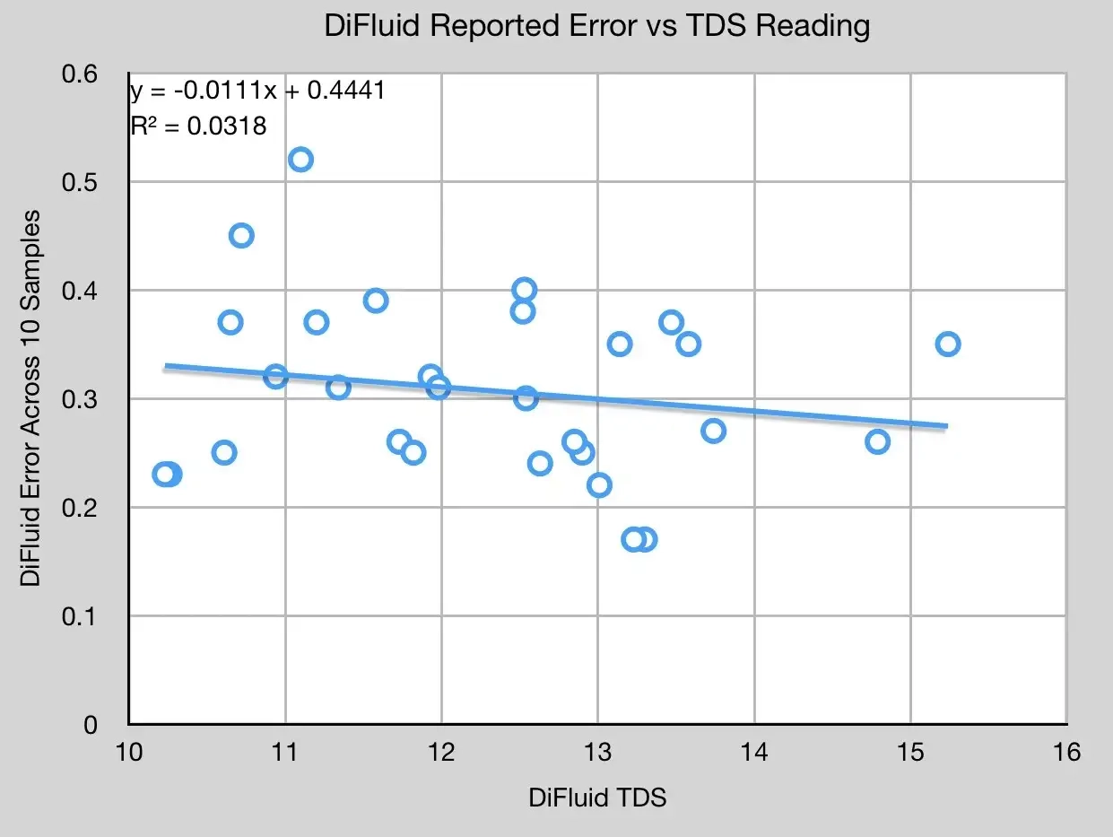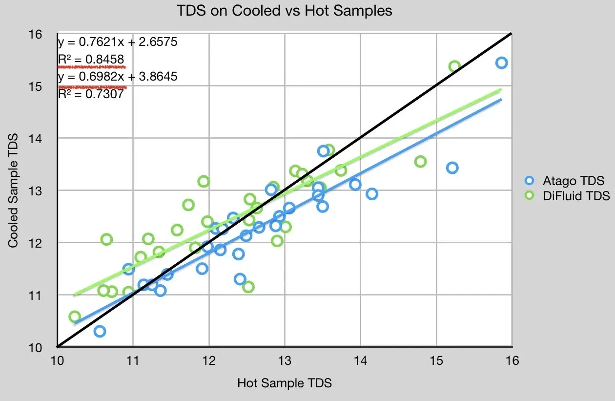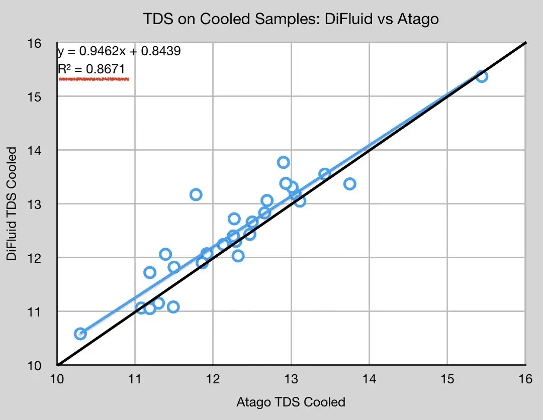 DiFluid와 Atago를 사용해 29쌍의 데이터 포인트를 수집했다. 그중 28쌍의 샘플은 냉각 처리하였고, 또 다른 TDS 샘플도 수집했다. DiFluid의 경우, 10개 샘플 평균화 기능만 사용했다. 대부분의 경우 DiFluid가 TDS 값을 줄여 말하는 추세지만, 이 추세는 y = x 값에 매우 근접하기 때문에 여전히 흥미로운 상쇄 값을 가진다.