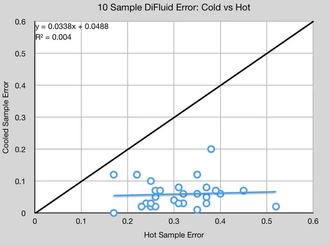 오류율을 살펴보면 차가운 샘플의 오류율이 매우 낮은 관계로, 굳이 여러 샘플이 필요한 것 같진 않다. 앞서 언급했듯 DiFluid는 질량이 적기 때문에 Atago 또는 VST 만큼의 온도 안정성을 갖지 않는다.