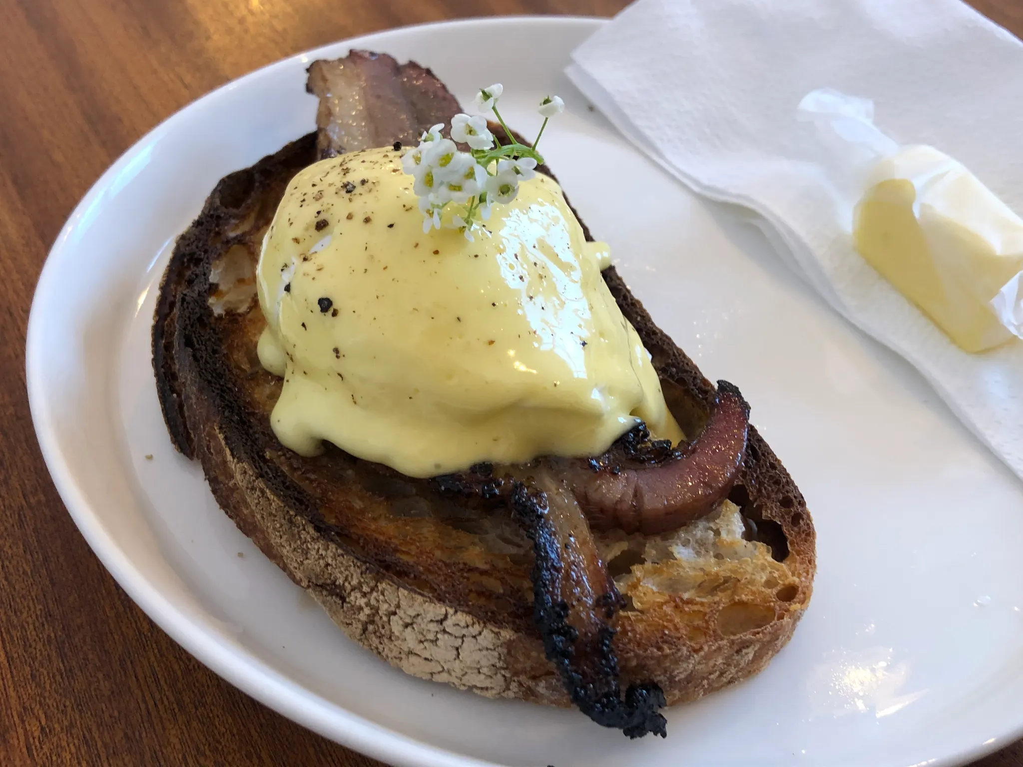 하우스 메이드 베이컨과 홀랜다이저 소스를 올린 에그베네딕트