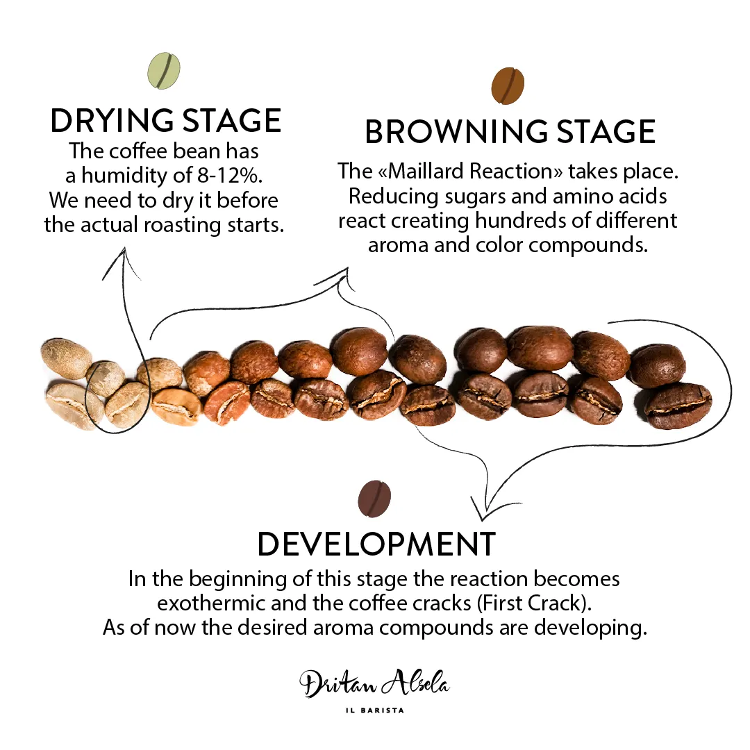이 단계의 시작에서 반응은 발열성으로 바뀌고, 커피가 크랙을 일으킵니다.(첫 번째 크랙)