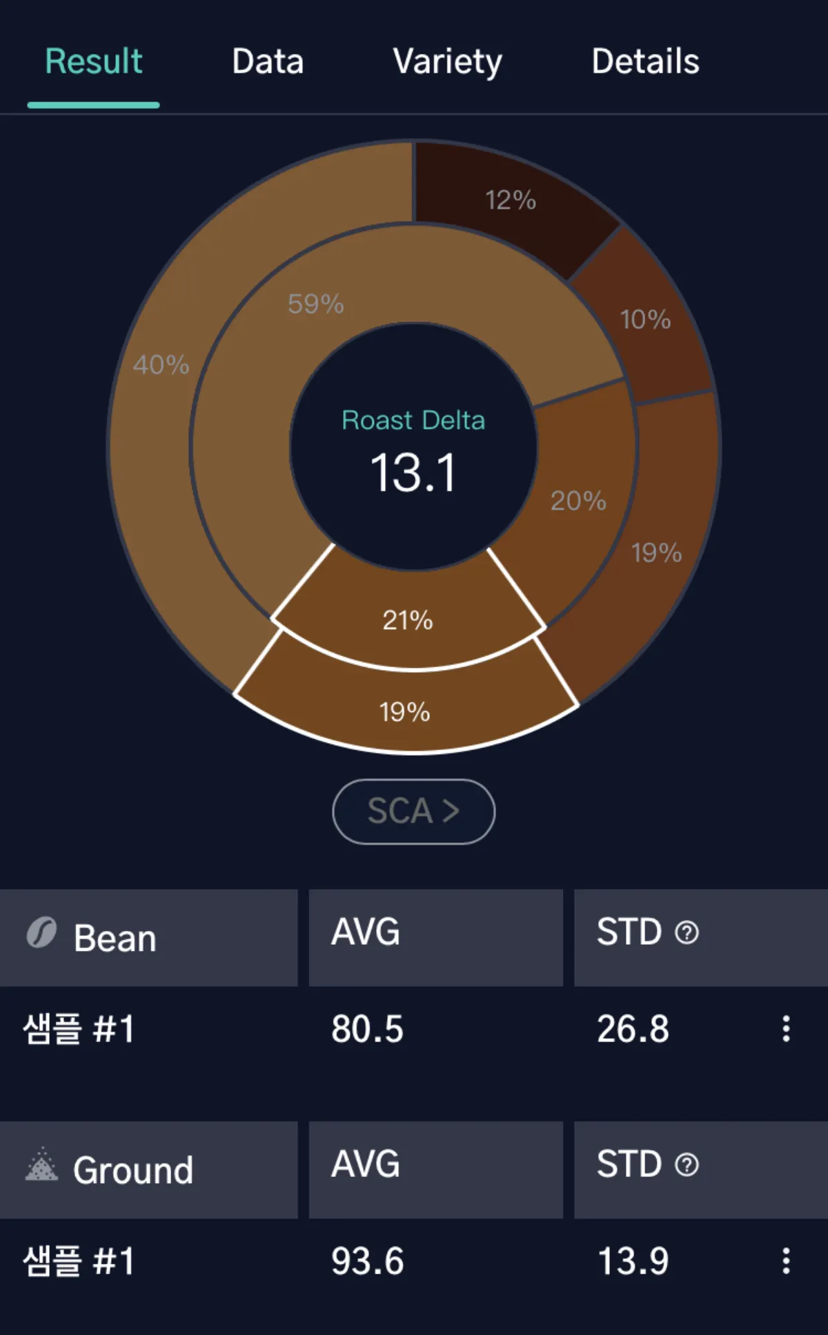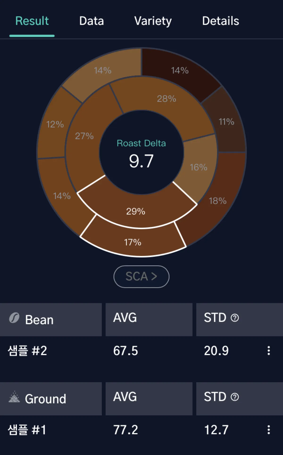 일반적으로 Roast Delta는 원두의 표면 색도와 분쇄 색도 차이를 나타내며, 이를 통해 로스팅의 균일성과 일관성을 평가할 수 있습니다.