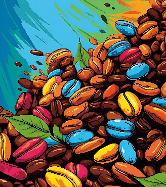 작품 : 다양한 원두를 여러 방법으로 볶아 많은 고객에게 전달하는 철학을 바탕으로, 다양한 색의 원두와 파란색 건물을 상징하는 바란색을 포함시켰습니다.