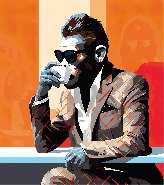 작품 : 로고의 원숭이가 더 세련되고 멋진 정장을 입고 커피를 마시는 모습으로 재해석하여 상상력을 발휘하여 그렸습니다.