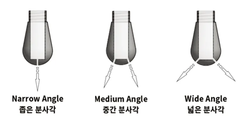 V 노치 V notch : 노즐 끝에 V 홈을 파서 분사 형태를 flat 하게 만들어준다. 흔히 세차장의 워터 건이나 페인트 스프레이 건에서 사용되는 것을 볼 수 있다.