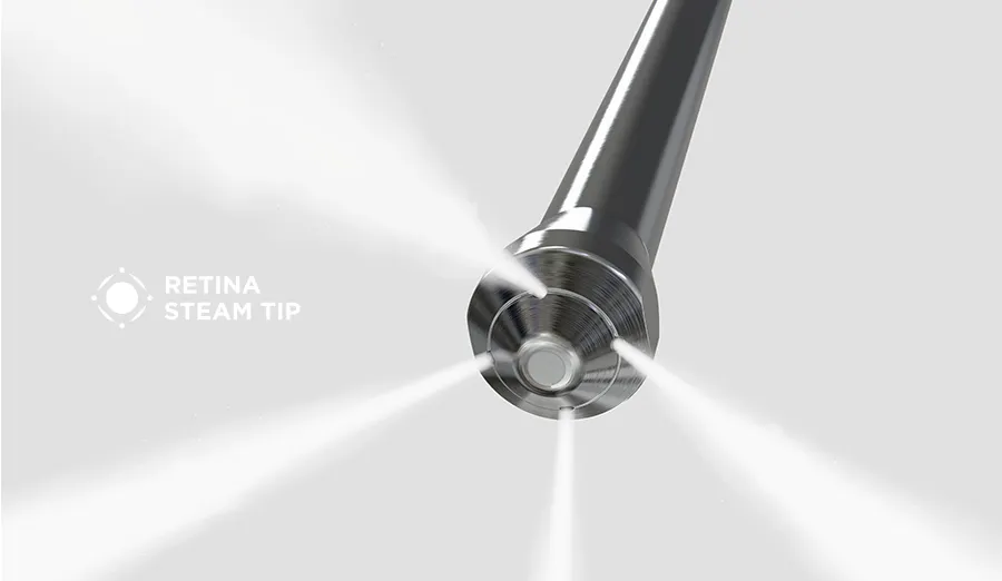 V 노치 적용 시 기존 스팀 팁의 원뿔형 분사 형태를 flat 한 형태로 변환시켜 스팀의 방향성을 보다 명확하게 해주어 silky 한 질감의 스티밍을 쉽게 할 수 있다.